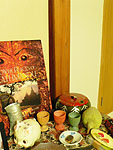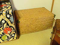 | 2007.9.12 しながわの骨董店で「ちゃぶ台」を2台買ったら、おまけで行李(こうり)をくださいました。うれしい! ちなみに、右端に見えるのはさる別荘で使われていたという古い和鏡台。 編集のボスからのいただきものです。 |